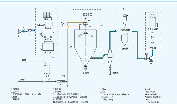 空气经过滤和加热,进入干燥器顶部空气分配器,热空气呈螺旋状均匀地进入干燥室。料液经塔体顶部的高速离心雾化器,(旋转)喷雾成极细微的雾状液珠,与热空气并流接触在极短的时间内可干燥为成品。成品连续地由干燥塔底部和旋风分离器中输出,废气由风机排空。